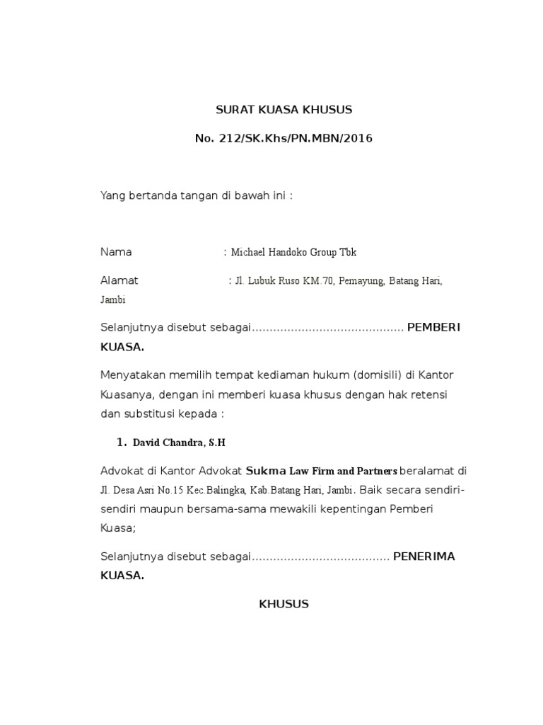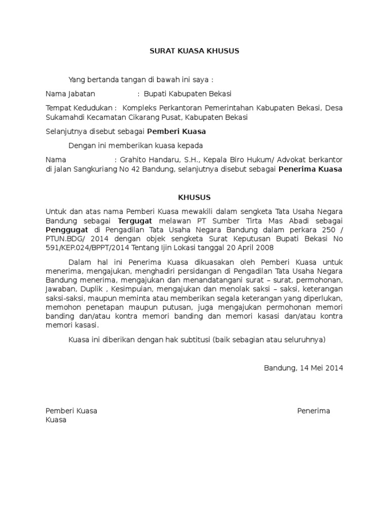 Khusus untuk dan atas nama oleh karenanya bertindak atas nama pemberi kuasa sebagai tergugat dalam gugatan tata usaha negara di pengadilan tata usaha negara. Richard, direktur utama, bertindak untuk dan atas nama pt. Sebelum saya memberikan beberapa contoh surat kuasa khusus. Ada yang pernah membuat surat kuasa enggak ? Hal ini dilakukan karena si pemberi kuasa tidak dapat melakukan suatu.