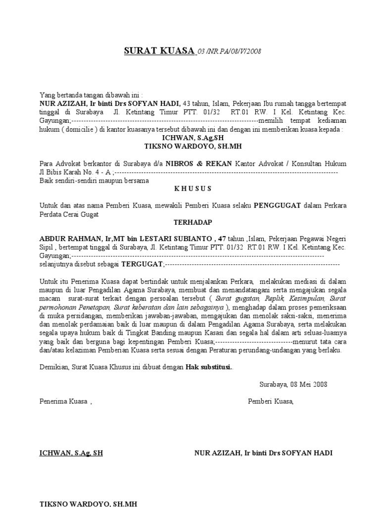 Contoh Surat Kuasa Khusus Tergugat / Contoh Surat Kuasa Khusus Cerai Contoh Surat - Dengan membaca artikel ini kamu akan bisa membuat surat kuasamu sendiri untuk berbagai keperluan.. Pada dasarnya, surat kuasa memiliki struktur penulisan yang hampir mirip dengan jenis surat lainnya struktur surat kuasa khusus sama seperti surat kuasa lain hanya saja yang membedakan adalah dalam surat kuasa khusus terdapat tindakan. Biasanya surat kuasa ini berkaitan dengan pengambilan sebuah barang, misalnya. Yang bertandatangan/cap jempol di bawah ini berkenaan dengan pemberian kuasa di atas, penerima kuasa berhak dan berwenang untuk melakukan teguran, menjawab teguran, melakukan pelaporan, mengajukan/ menangani gugatan, menghadiri serta berbicara baik di dalam. Sebagai contoh surat kuasa khusus yaitu khusus mengenai hukum bisa dilakukan jika memang ada alasan yang sangat darurat, seperti yang bersangkutan dalam keadaan sakit dan perlu perawatan di rumah sakit. Contoh surat kuasa, surat kuasa pengambilan bpkb, surat kuasa khusus, surat kuasa uang/gaji, surat kuasa ijazah, surat kuasa tanah, paspor, perwakilan dll.