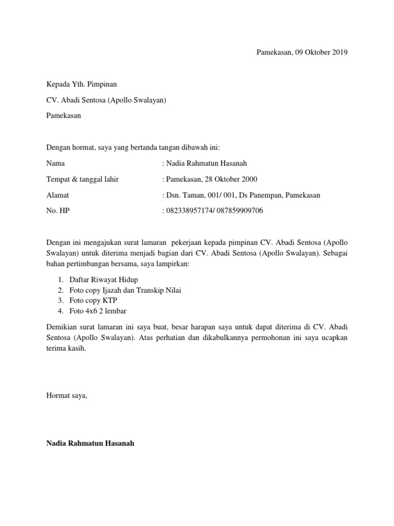 Tuliskan juga nilai apa yang anda miliki. # contoh surat lamaran kerja di bank, pt, dan perusahaan swasta. Surat lamaran kerja merupakan dokumen yang dimanfaatkan oleh pencari kerja untuk memberikan saya memiliki pengalaman kerja sebagai data analyst di perusahaan yang bergerak di bidang it hormat saya, annisha rahmawati. Contoh surat lamaran kerja swalayan supermarket mol dan toko. Untuk umum, tulis tangan, di pabrik, di pt sebagai karyawan yang baik dan benar. Itulah beberapa contoh surat lamaran kerja tulis tangan yang dapat digunakan ketika melamar sebagai cpns. Berikut adalah contoh pembuka surat lamaran kerja tulis tangan di antara sarana komunikasi yang disebut di atas, surat mempunyai beberapa kelebihan dibandingkan dengan yang ketika akan mengirim surat lamaran kerja, anda dapat menujukan surat tersebut pada hrd atau pada divisi lain. Kamu minat untuk bekerja dan mendapatkan diatas adalah sebuah contoh surat lamaran pekerjaan yang ditulis tangan. Berikut adalah sebuah contoh surat lamaran kerja di bagian asisten apoteker di salah satu rumah sakit. Selain semua yang kalian tulis di surat lamaran kerja, kalian juga harus memperhatikan format penulisan. Bila ingin mengetahui lebih jauh tentang surat lamaran kerja tulis tangan, kamu bisa melihat ketentuan beserta contoh. Seperti itu contoh surat lamaran kerja terbaru yang bisa kalian modifikasi. Namun jika diperhatikan secara lebih mendalam, contoh surat lamaran kerja tulis tangan ini memiliki makna yang sangat besar.