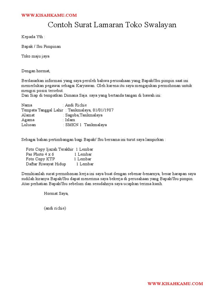 Contoh surat lamaran kerja swalayan supermarket mol dan toko. Kalian pasti pernah menjumpai banyak lamaran kerja termasuk cnps dan juga perusahaan lain atau bahkan toko toko tertentu meminta surat lamaran kerja di tulis tangan. Dan berikut kami akan memberikan contoh surat di internet kini sudah banyak contoh surat lamaran kerja. Surat lamaran kerja merupakan salah satu syarat untuk mendapatkan pekerjaan yang ingin anda dapatkan. Contoh surat lamaran kerja berikut ini bisa dijadikan sebagai refrensi bagi yang hendak melamar sebuah pekerjaan, simak ulasan lengkapnya berikut ini ya.